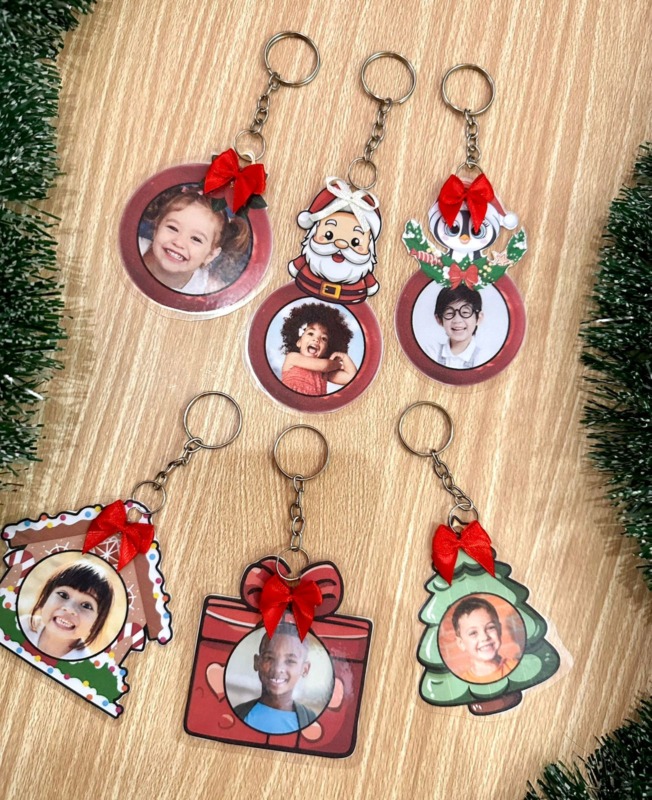 📎 Arquivo com 6 modelos de chaveiros tema Natal, todos com a opção de personalizar com a foto da criança, tornando a lembrancinha ainda mais especial e única.